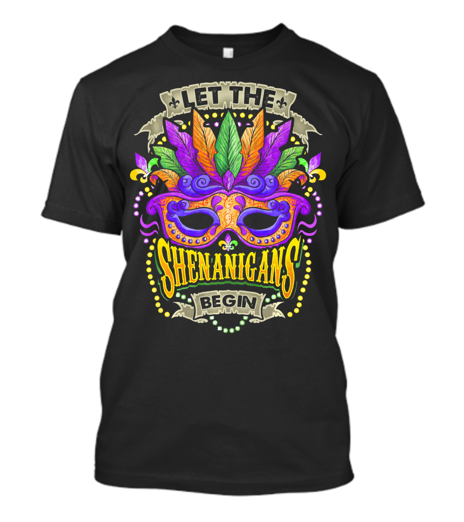 Let The Shenanigans Begin Mardi Gras Mask With Feathers And Beads T-Shirt