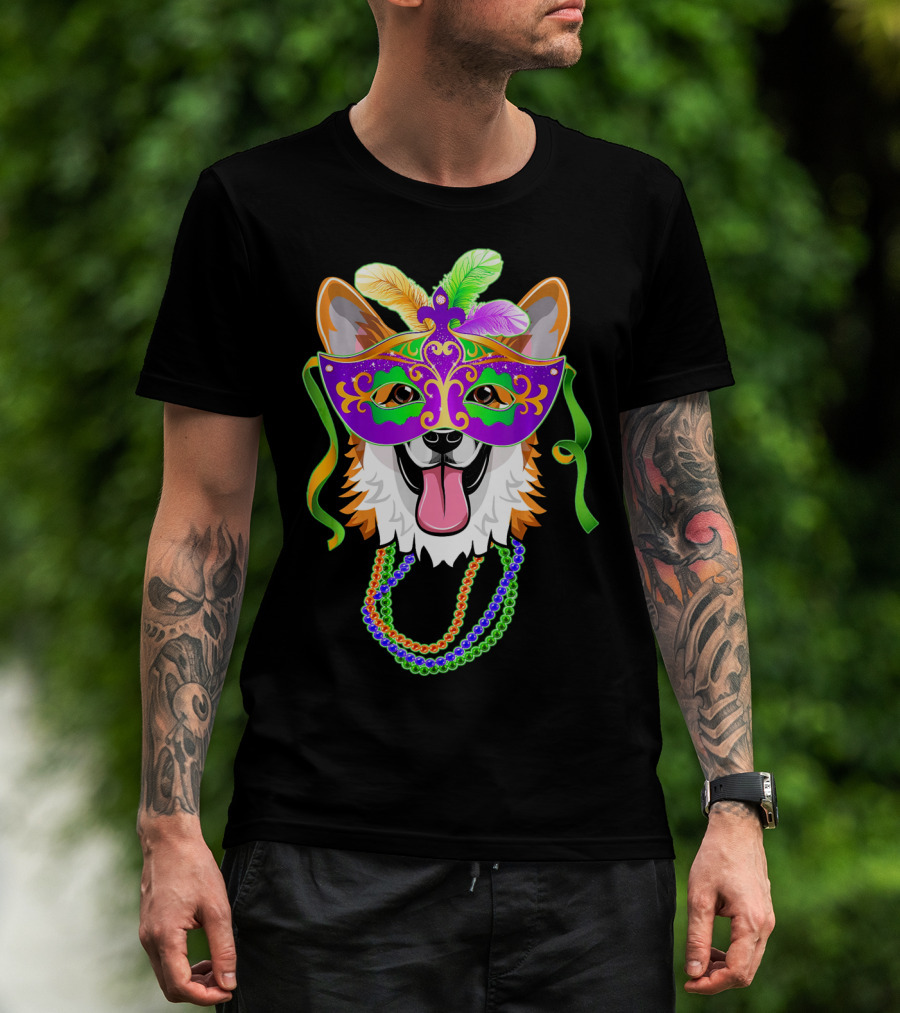 Mardi Gras Corgi Mask With Colorful Beads And Feathers T-Shirt