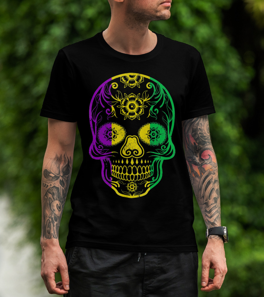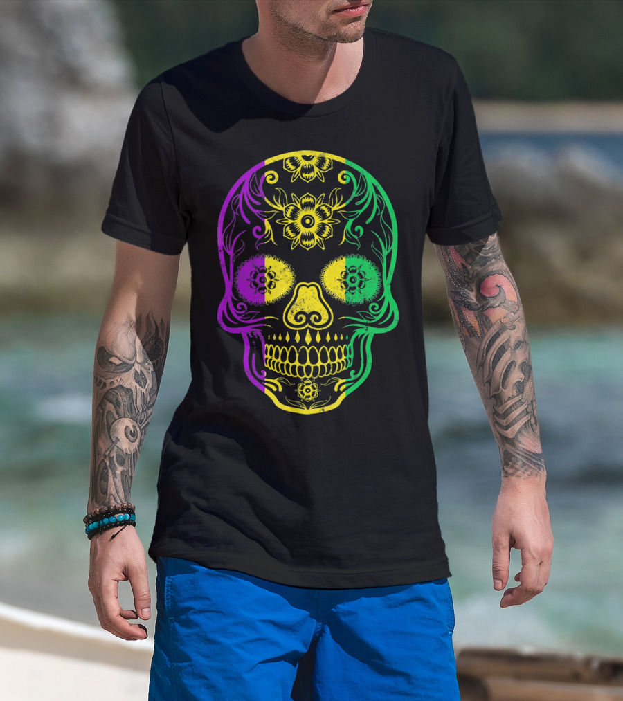 Mardi Gras Skull In Vibrant Purple Green And Yellow Fat Tuesday Colors T-Shirt