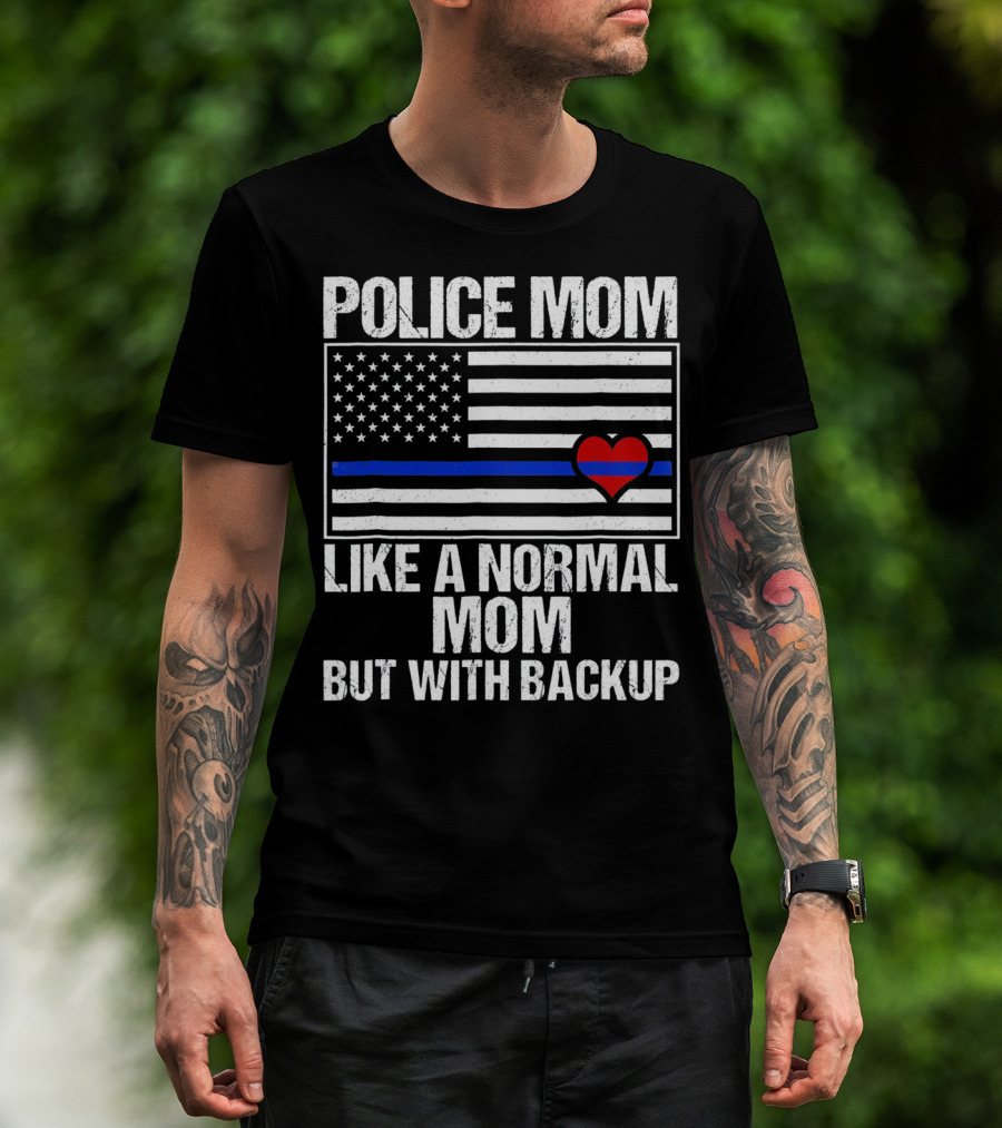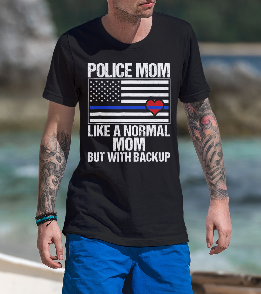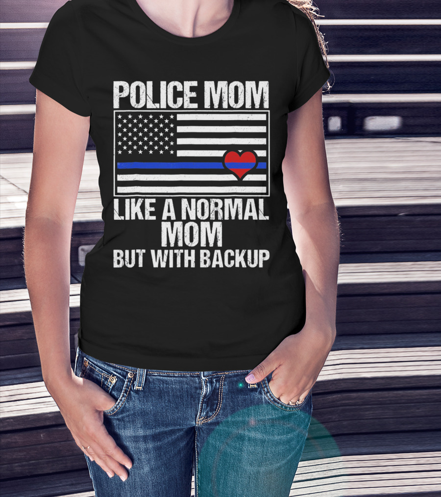 Police Mom Like A Normal Mom But With Backup Blue Line Flag Heart T-Shirt
