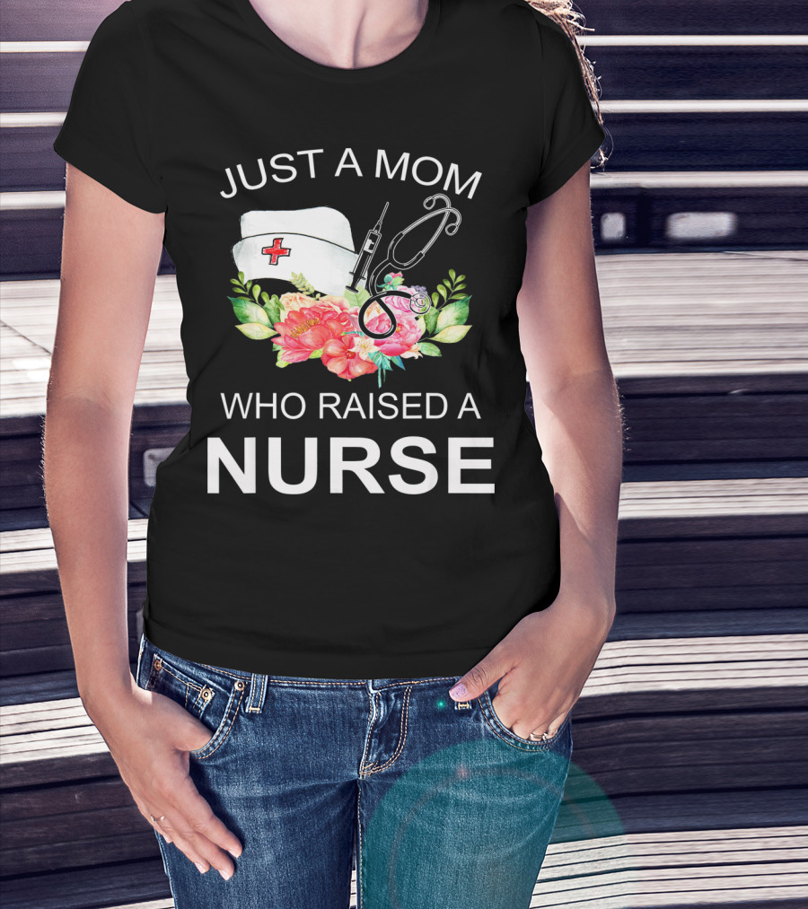 Just A Mom Who Raised A Nurse With Flowers Nurse Cap Syringe And Stethoscope T-Shirt