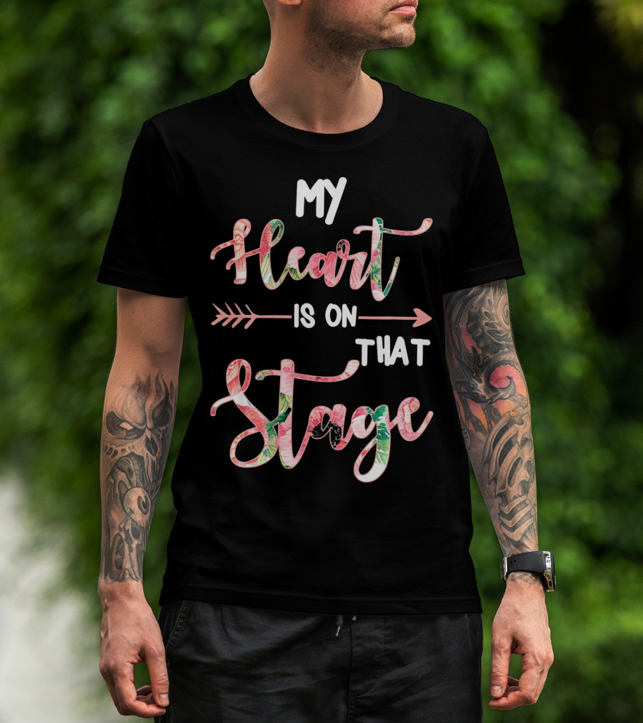 The My Heart Is On That Stage T-shirt is designed for everyday wear and a consistent fit. Fabric is pre-shrunk ring-spun cotton with durable stitching. See the size chart below for exact measurements.