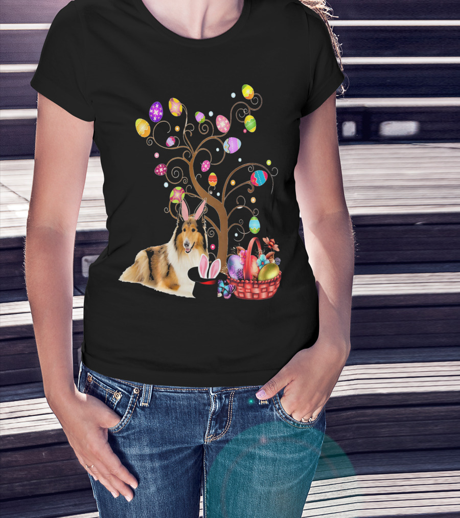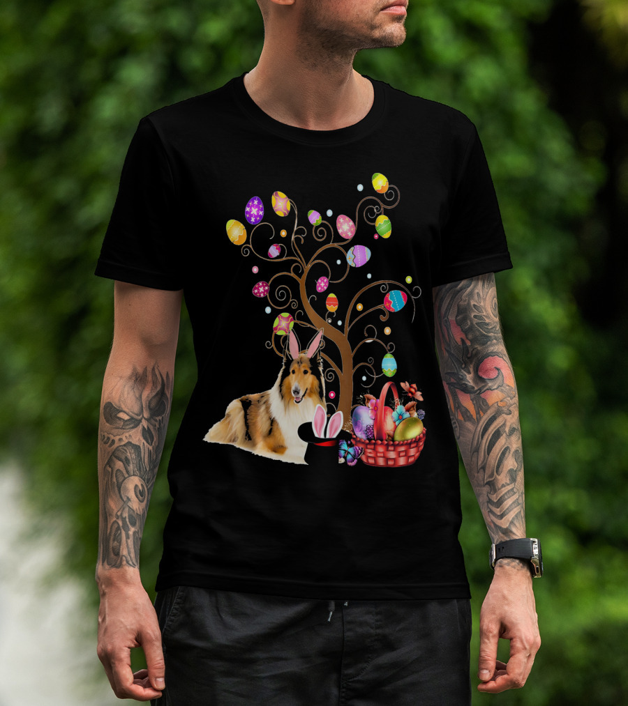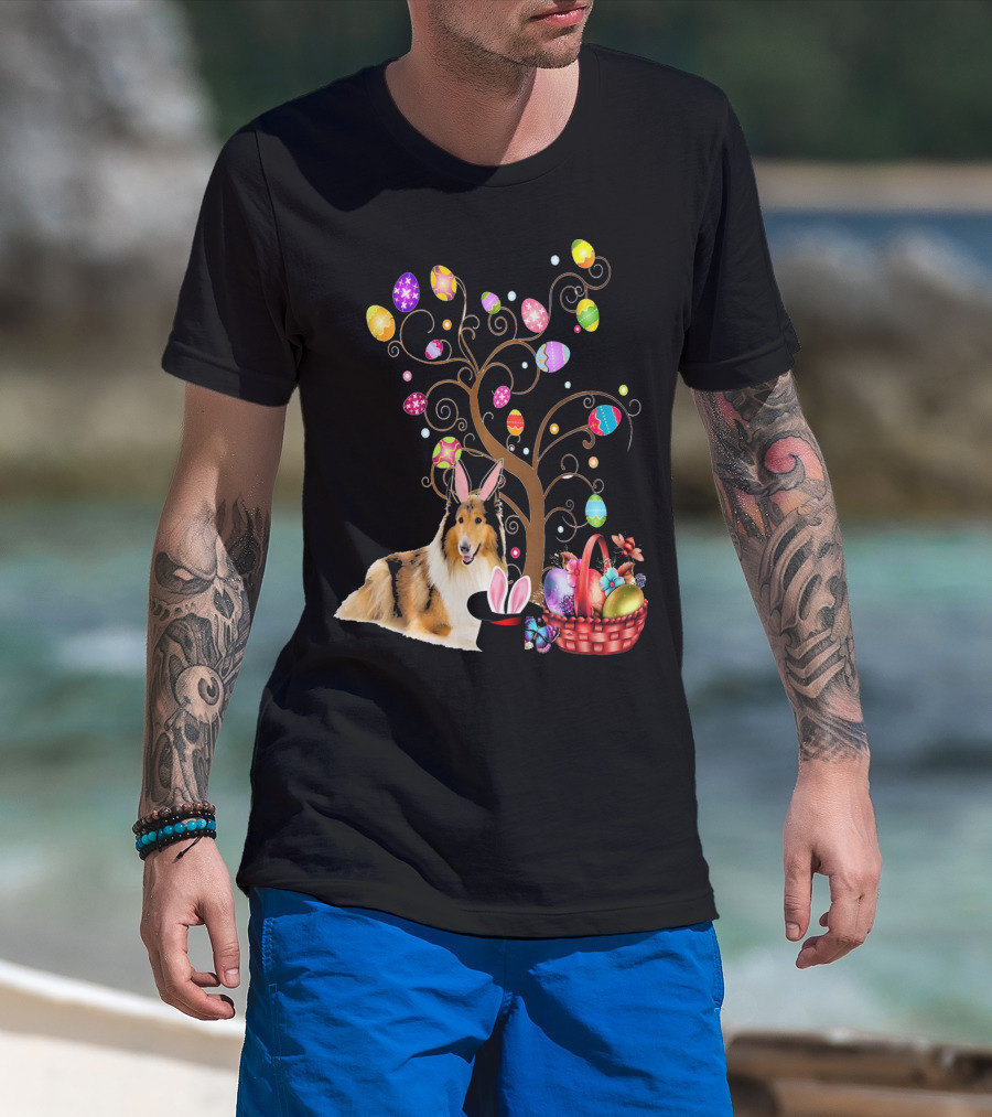Bunny Rough Collie Easter Day Hunting Eggs Basket Tree T-Shirt