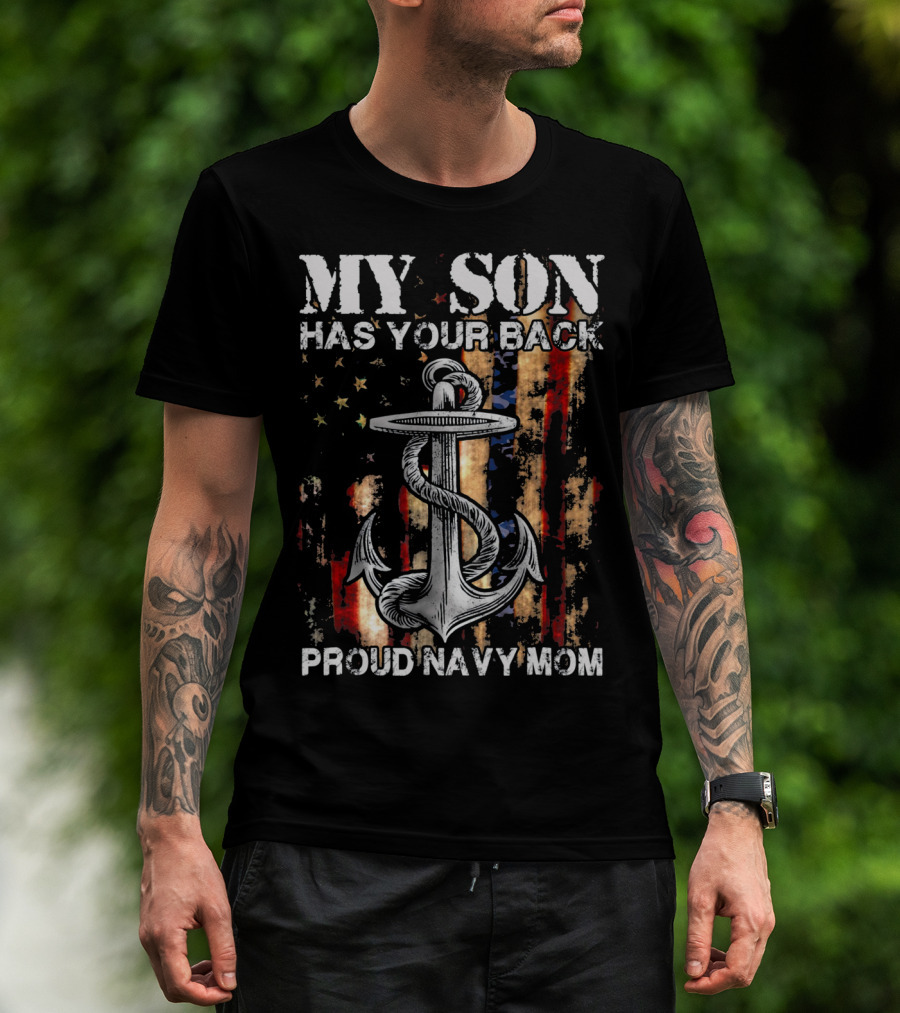 MY SON HAS YOUR BACK PROUD NAVY MOM Anchor Flag T-Shirt