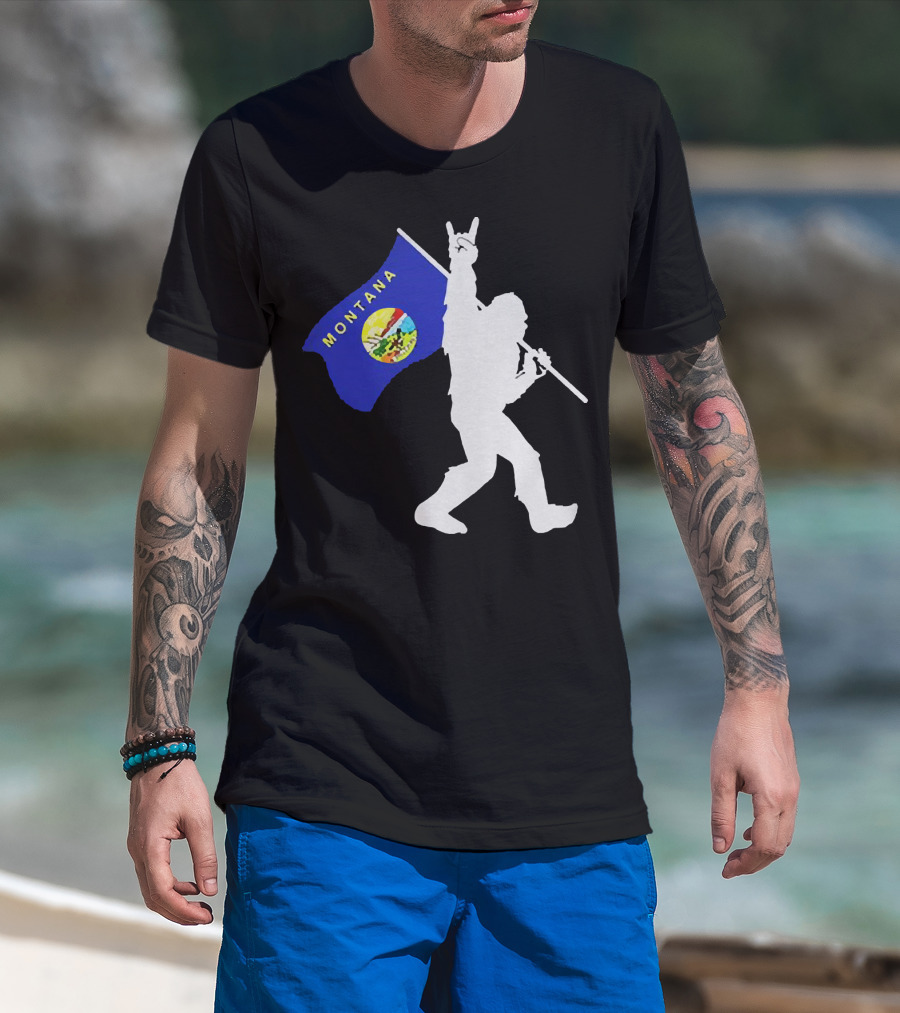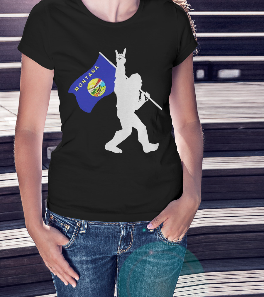 Bigfoot Holding Montana State Flag Middle Finger Gesture T-Shirt