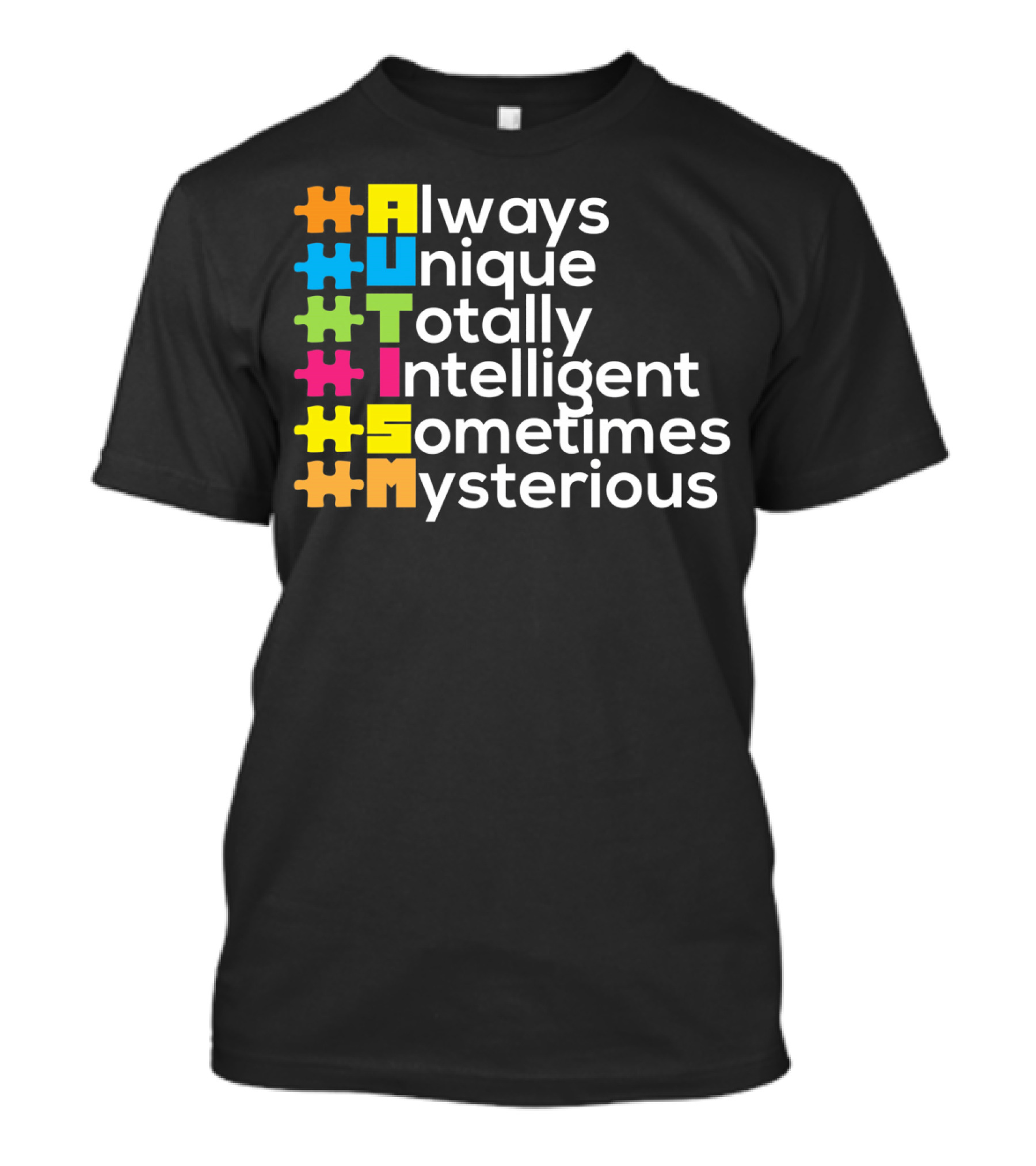 The Autism Awareness Always Unique Totally Intelligent Sometimes Mysterious T-shirt is designed for everyday wear and a consistent fit. Fabric is pre-shrunk ring-spun cotton with durable stitching. See the size chart below for exact measurements.
