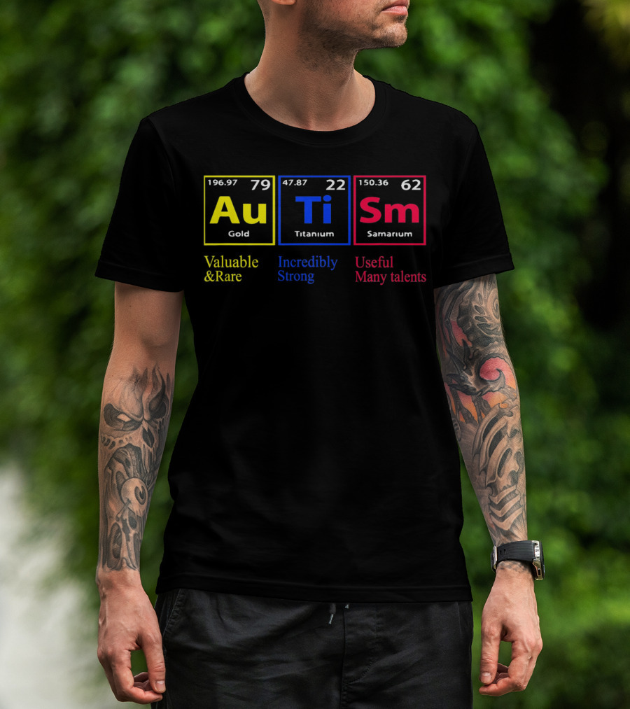 Au Ti Sm Autism Awareness Valuable And Rare Incredibly Strong Useful Many Talents Periodic Table T-Shirt