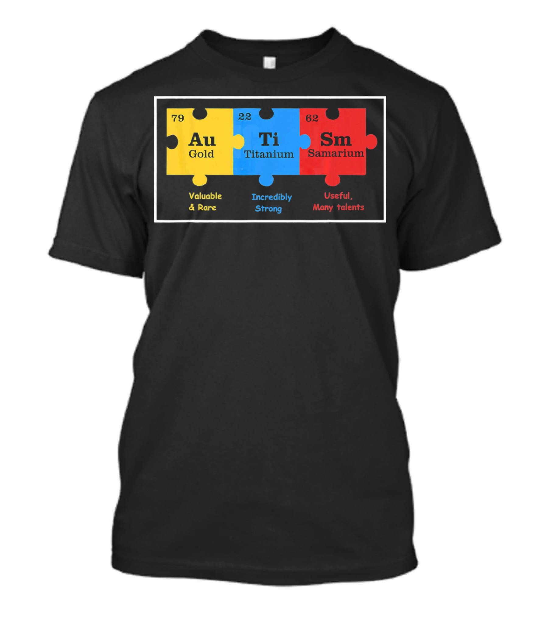 The Valuable Rare Gold Incredibly Strong Titanium Useful Many Talents Samarium Puzzle Autism Chemical Elements Awareness T-shirt is designed for everyday wear and a consistent fit. Fabric is pre-shrunk ring-spun cotton with durable stitching. See the size chart below for exact measurements.