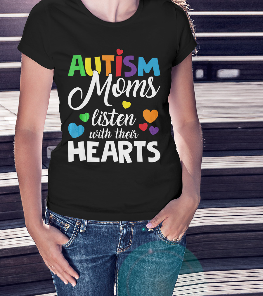 Autism Moms Listen With Their Hearts Colorful Text And Hearts T-Shirt