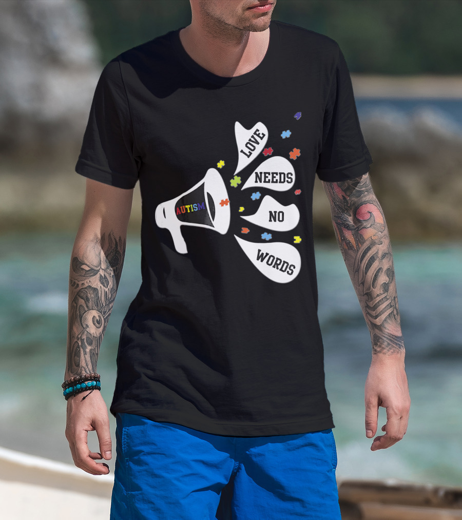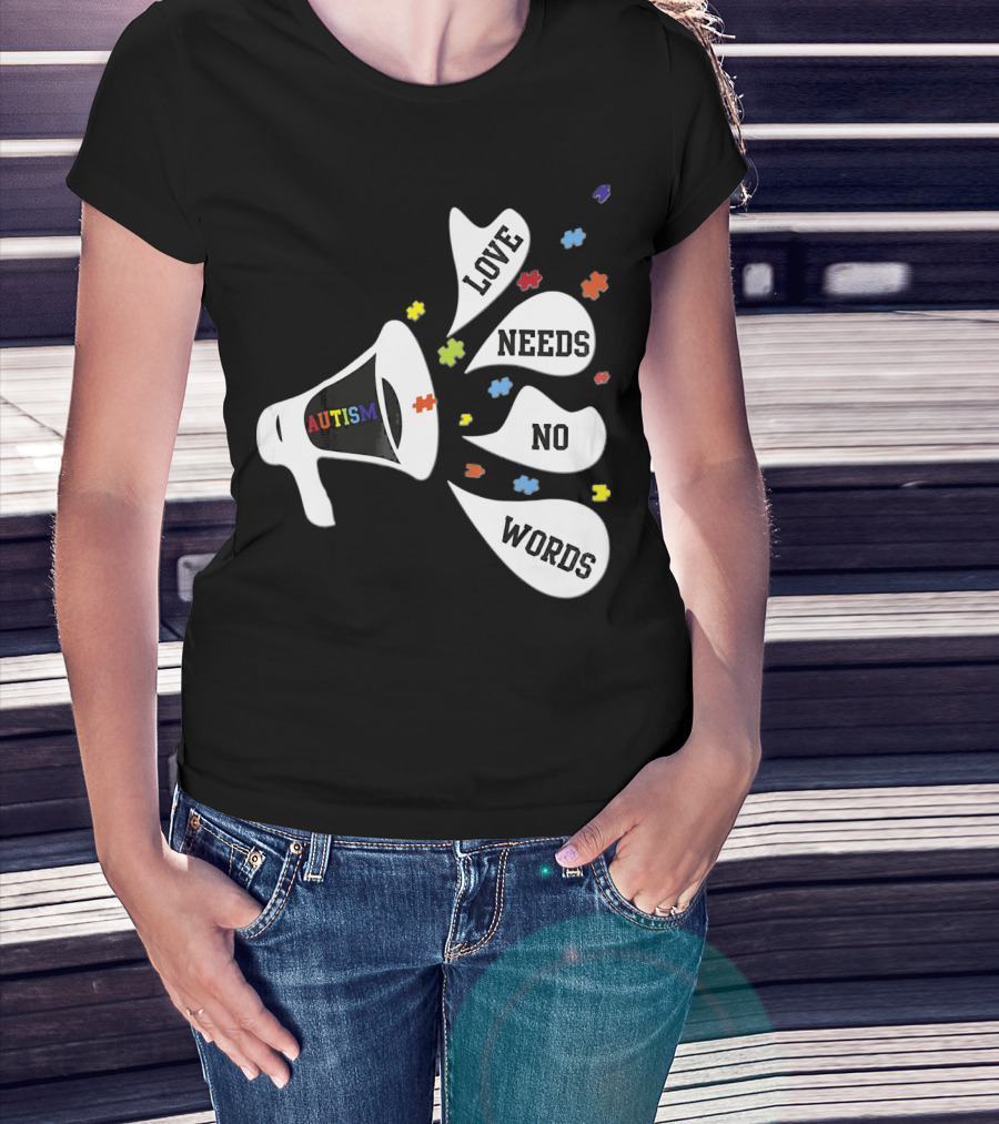 Autism Love Needs No Words Awareness Puzzle Pieces Megaphone T-Shirt