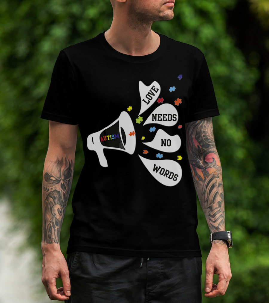 The Autism Love Needs No Words Awareness Puzzle Pieces Megaphone T-shirt is designed for everyday wear and a consistent fit. Fabric is pre-shrunk ring-spun cotton with durable stitching. See the size chart below for exact measurements.