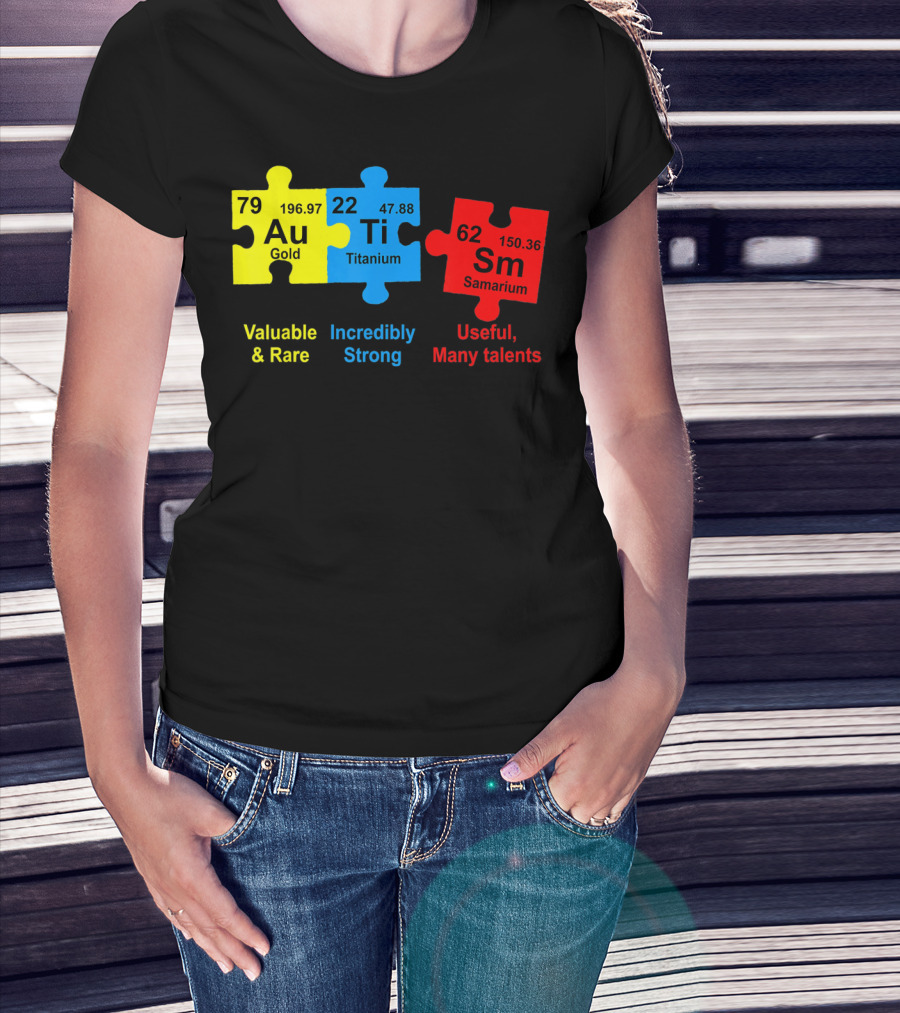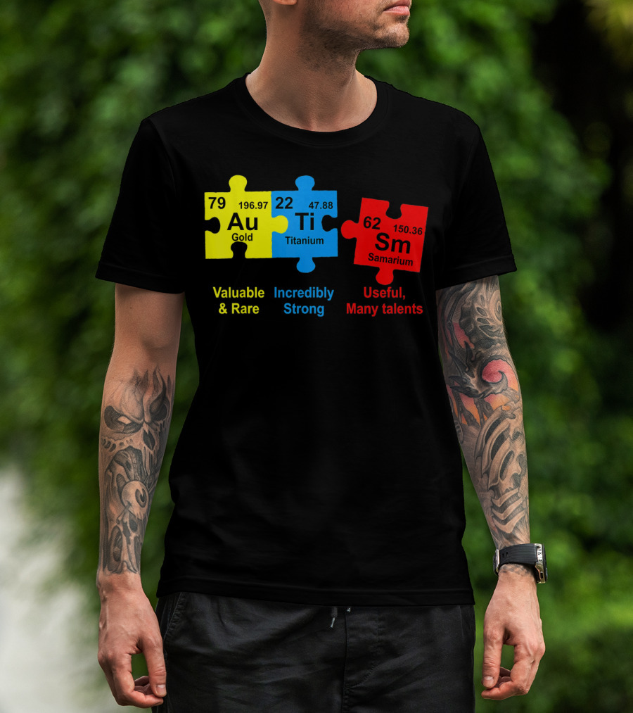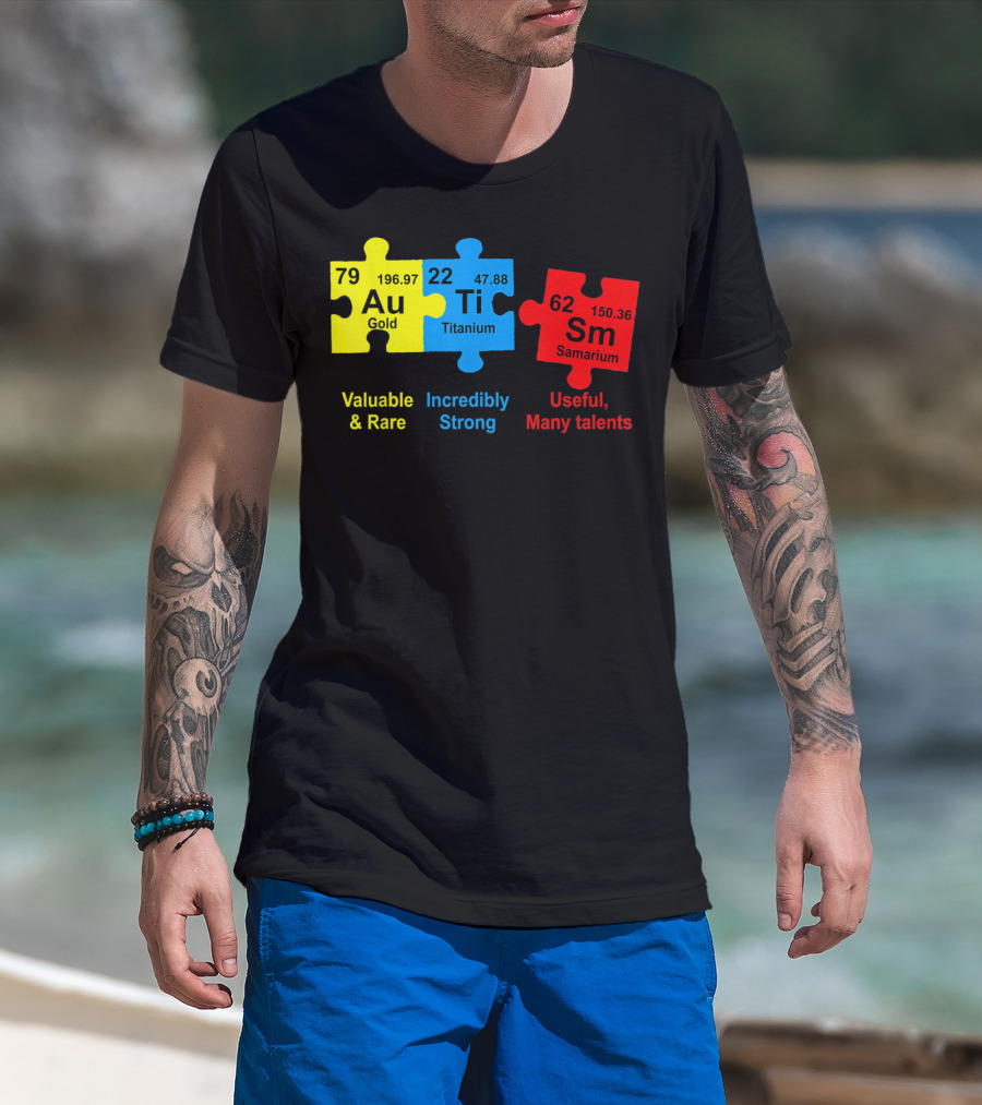 Autism Awareness Puzzle Elements Gold Titanium Samarium Valuable Rare Incredibly Strong Useful Many Talents T-Shirt
