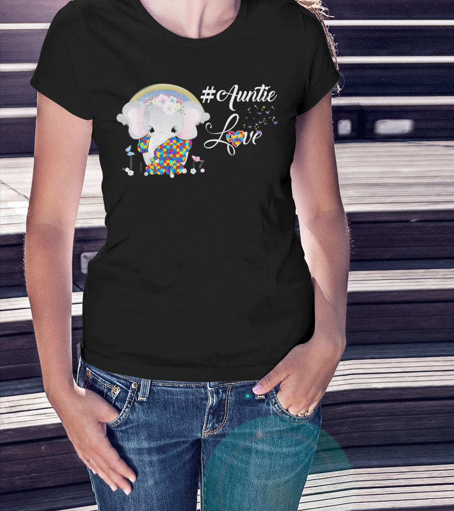 Auntie Love Autism Awareness Elephant With Colorful Puzzle Pattern And Rainbow T-Shirt