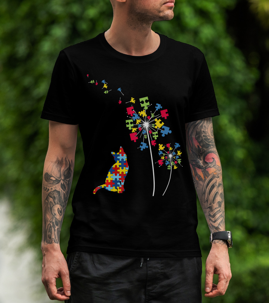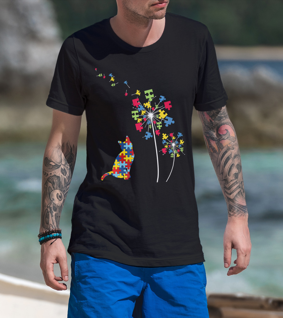 Colorful Puzzle Piece Cat And Dandelion Autism Awareness T-Shirt