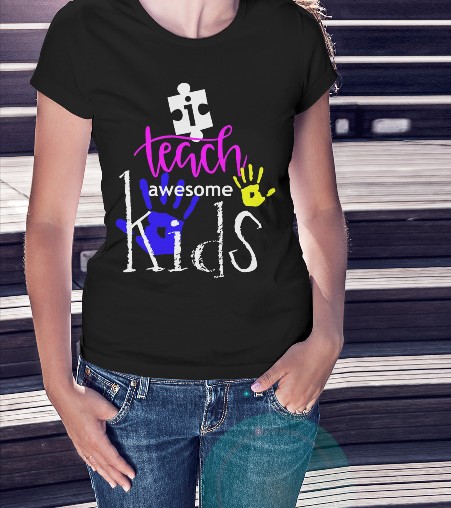 I Teach Awesome Kids Autism Puzzle Piece Handprints T-Shirt