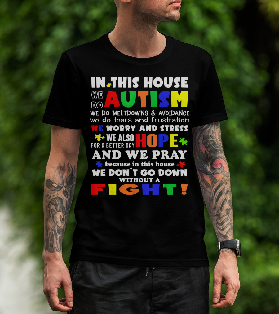 The In This House We Do Autism Hope and Fight T-shirt is designed for everyday wear and a consistent fit. Fabric is pre-shrunk ring-spun cotton with durable stitching. See the size chart below for exact measurements.