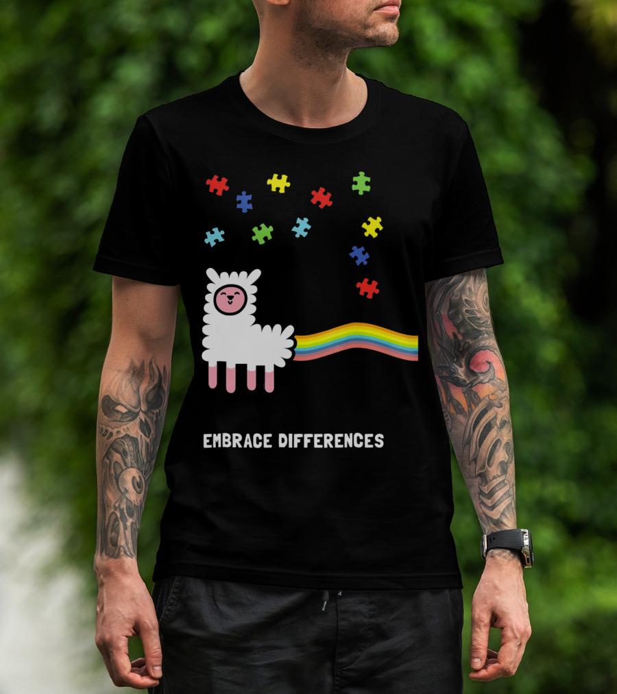 Embrace Differences Autism Awareness Llama Rainbow Puzzle Pieces T-Shirt