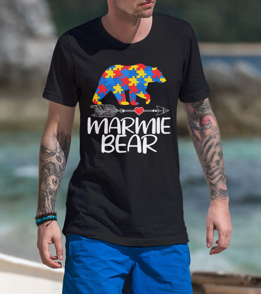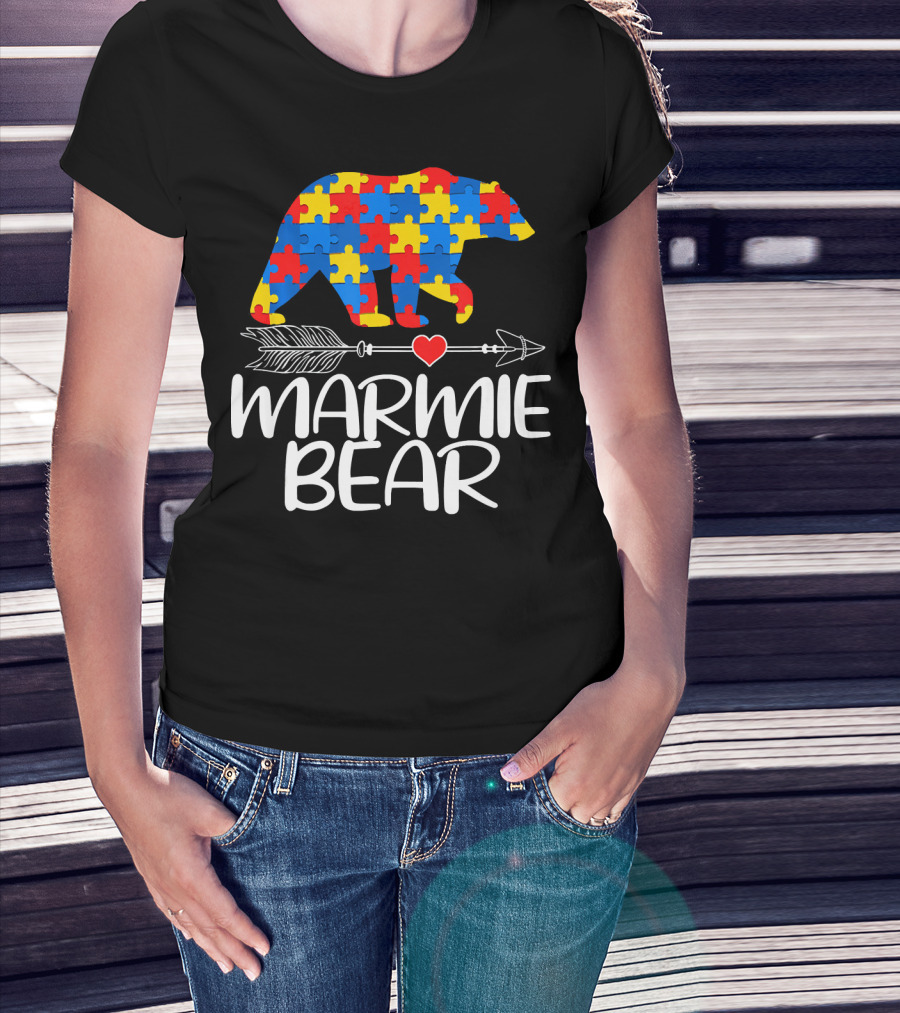 Marmie Bear Autism Awareness Puzzle Heart Arrow T-Shirt