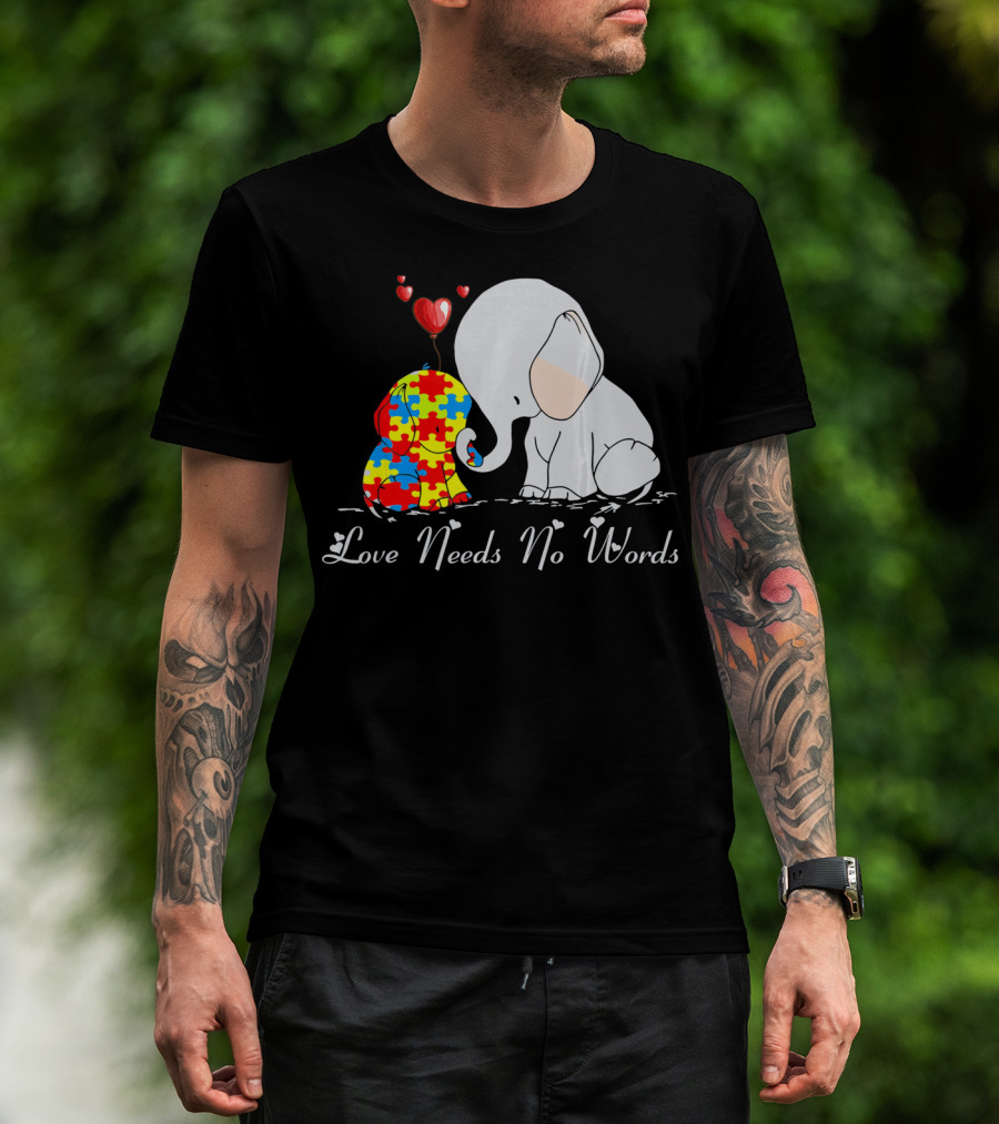 Love Needs No Words Autism Awareness Elephant Puzzle Hearts T-Shirt