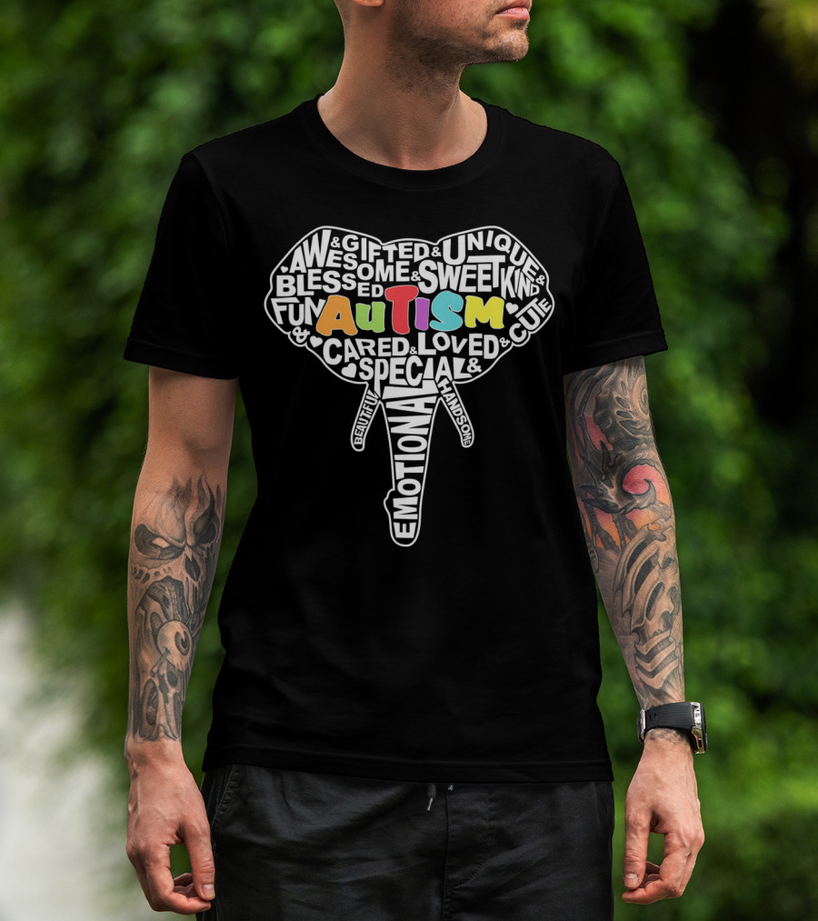 The Autism Gifted Awesome Unique Emotional Elephant Face T-shirt is designed for everyday wear and a consistent fit. Fabric is pre-shrunk ring-spun cotton with durable stitching. See the size chart below for exact measurements.