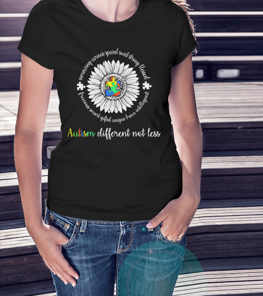 Autism Different Not Less Daisy Flower With Puzzle And Positive Words T-Shirt