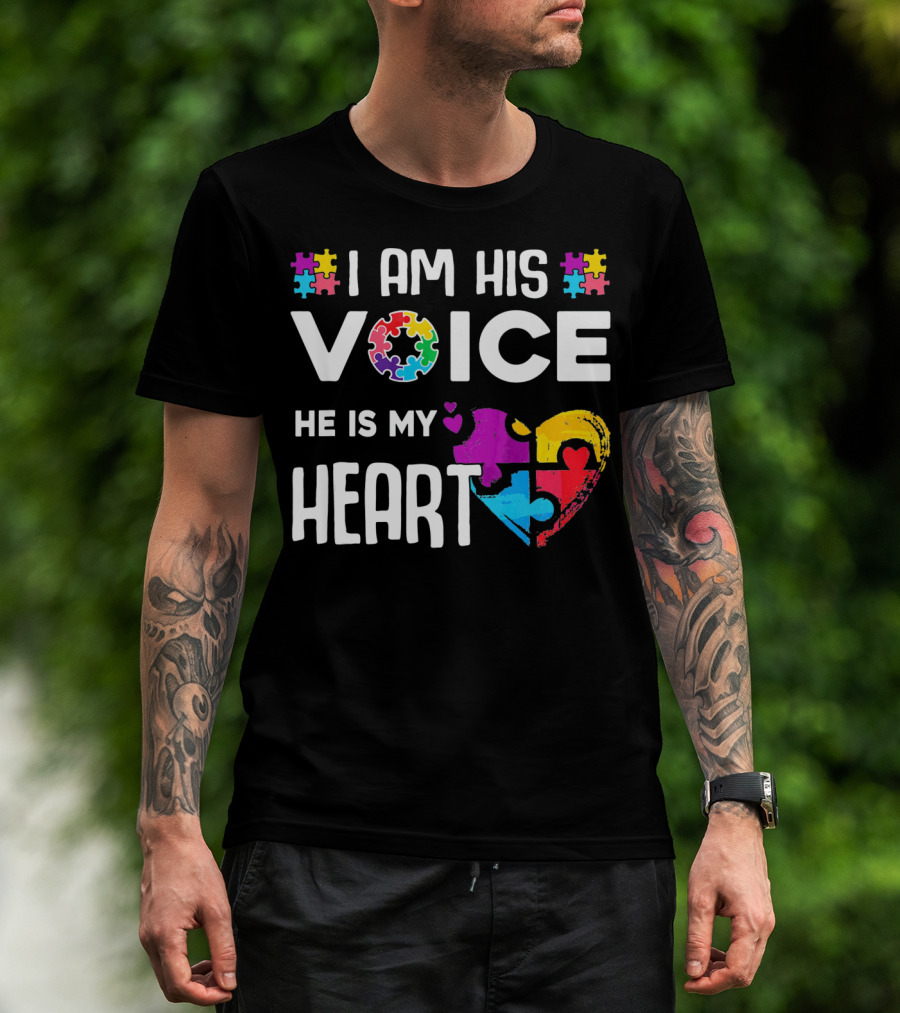 Autism Awareness I Am His Voice He Is My Heart Puzzle Piece Heart T-Shirt