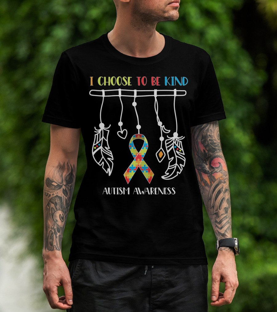 I Choose To Be Kind Autism Awareness Puzzle Ribbon With Dreamcatcher Feathers T-Shirt