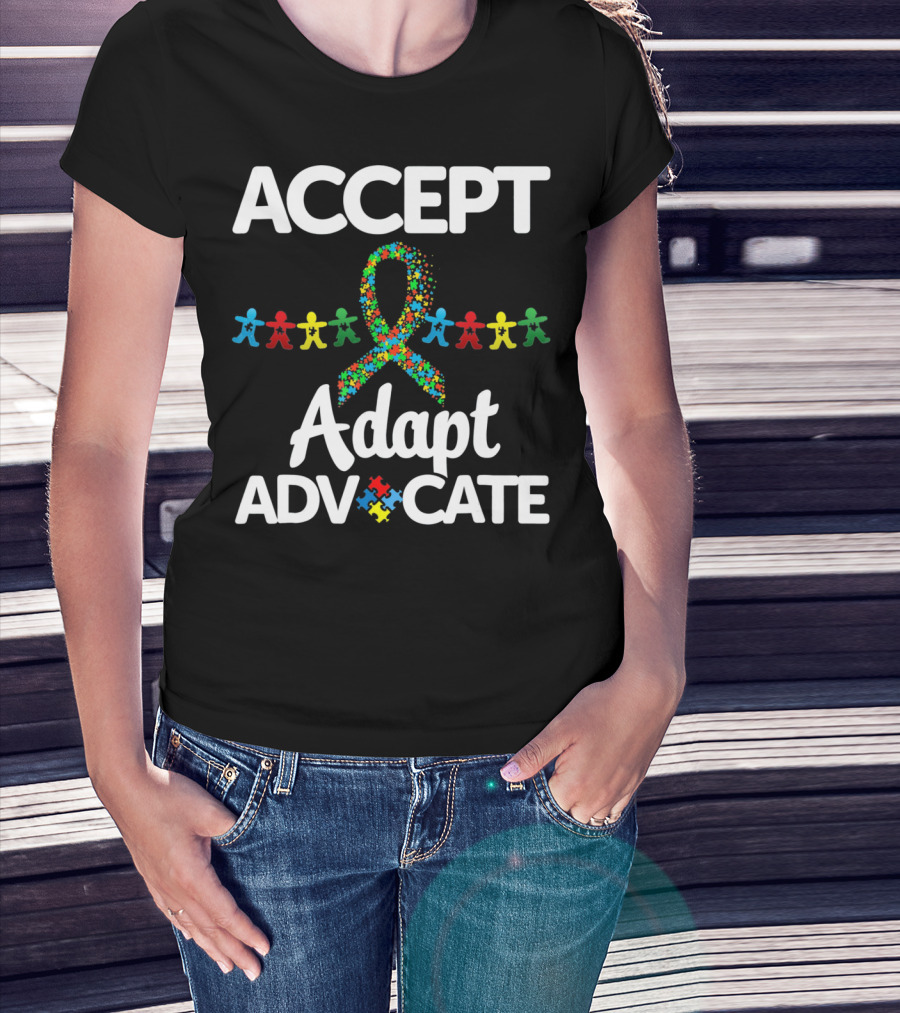 Accept Adapt Advocate Autism Awareness Puzzle Ribbon And Figures T-Shirt