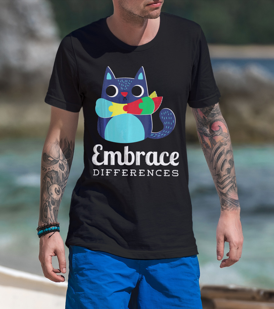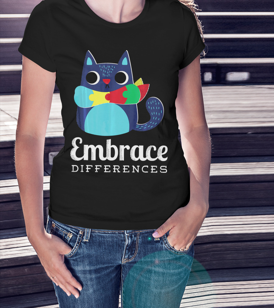 Embrace Differences Autism Support Awareness Puzzle Cat T-Shirt