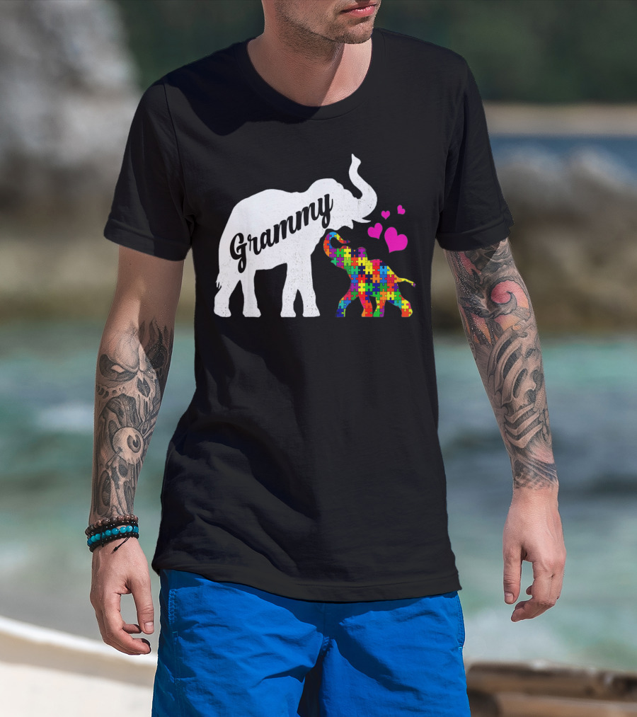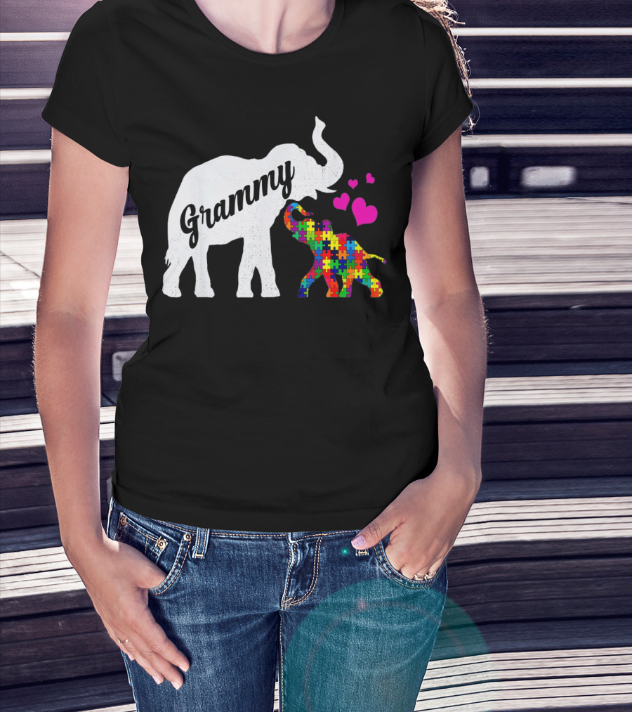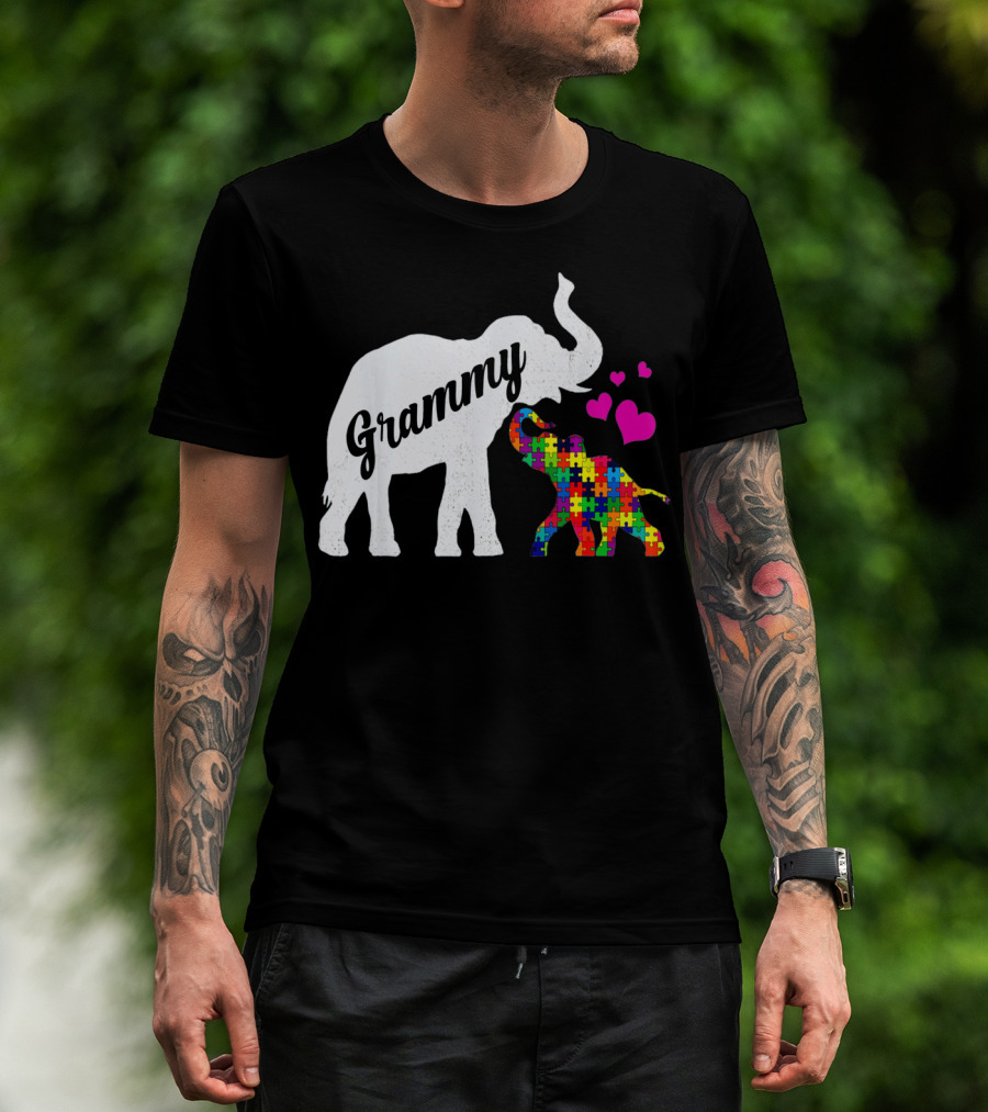 Grammy Elephant With Colorful Puzzle Piece Baby And Hearts For Autism Awareness T-Shirt