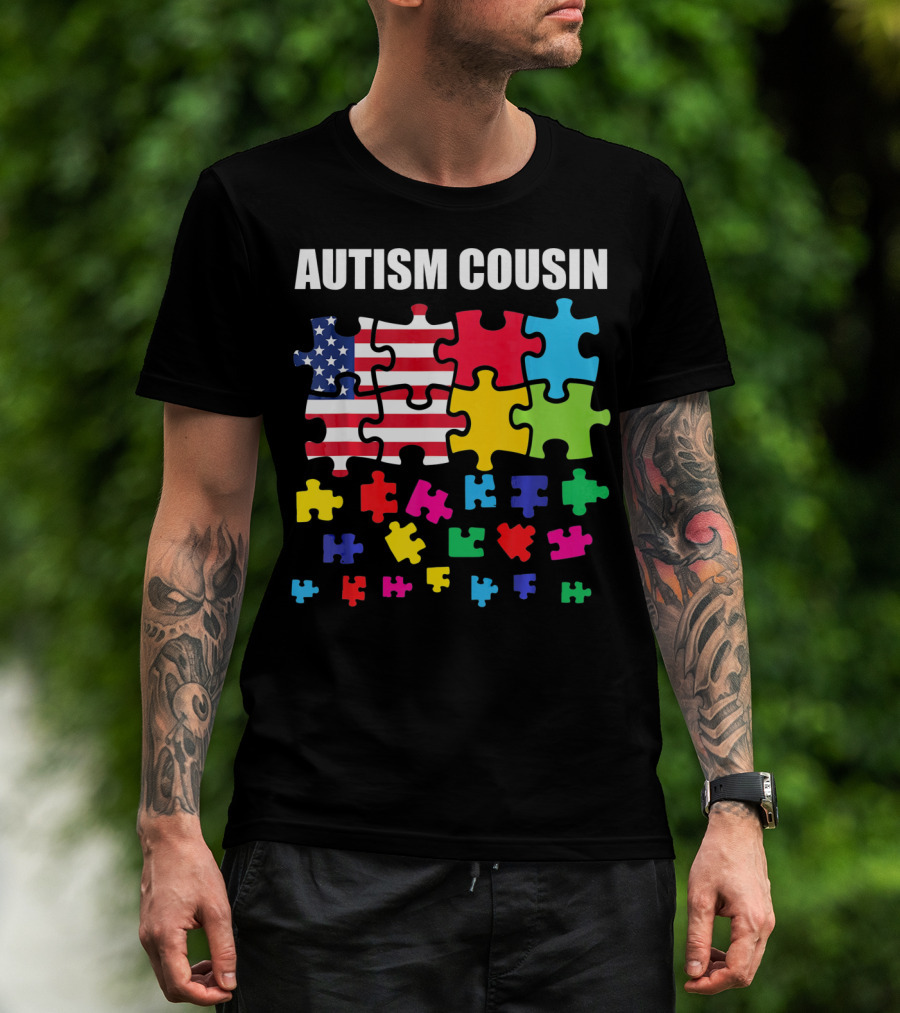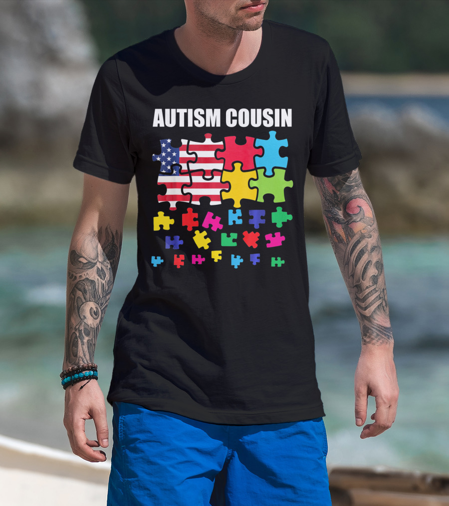 Autism Cousin Puzzle Pieces USA Flag Autism Awareness T-Shirt