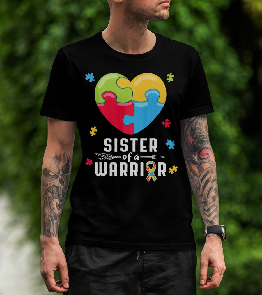 Sister Of A Warrior Autism Awareness Puzzle Heart T-Shirt