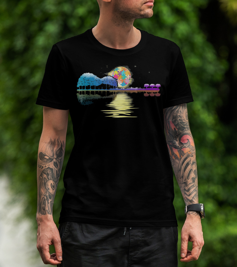 Guitar Lake Shadow Autism Puzzle Moon Reflection T-Shirt