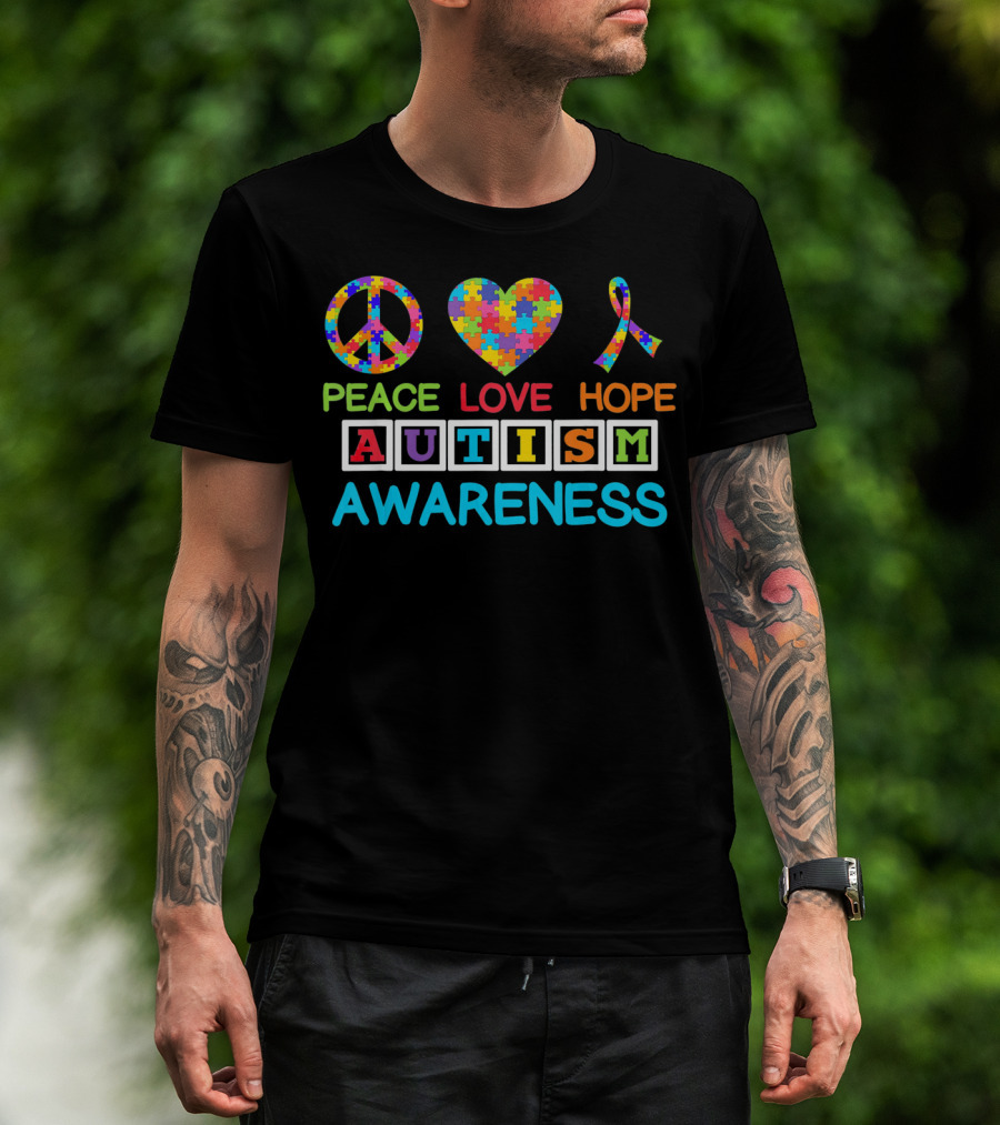 Autism Awareness Peace Love Hope Puzzle Ribbon Puzzle T-Shirt