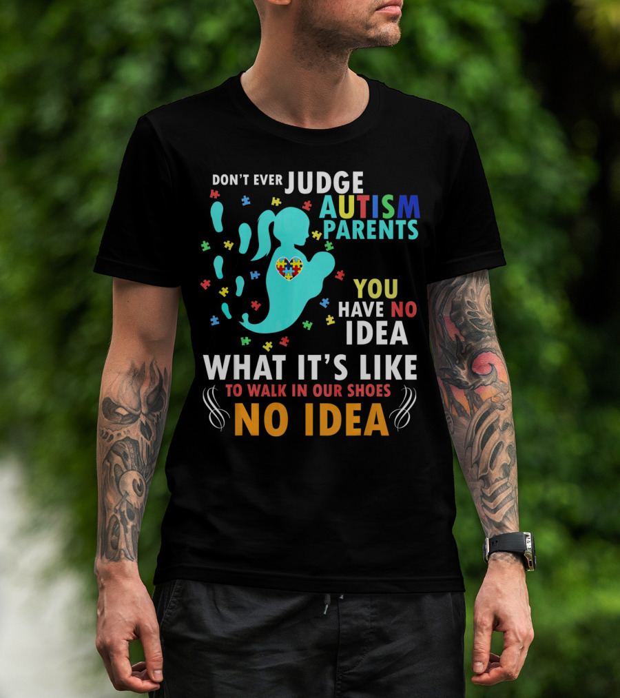 The DON'T EVER JUDGE AUTISM PARENTS YOU HAVE NO IDEA WHAT IT'S LIKE TO WALK IN OUR SHOES NO IDEA T-shirt is designed for everyday wear and a consistent fit. Fabric is pre-shrunk ring-spun cotton with durable stitching. See the size chart below for exact measurements.