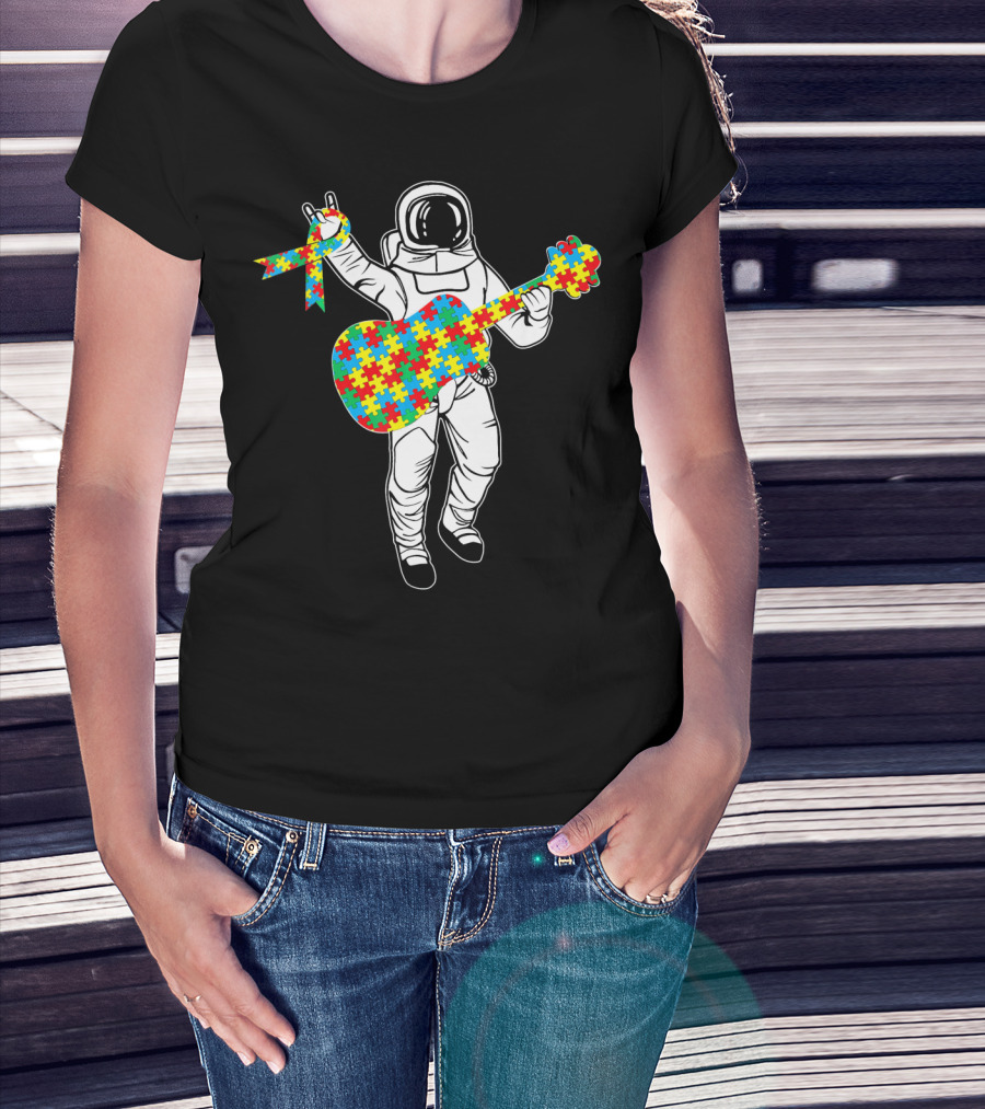 Astronaut Playing Guitar Autism Awareness Puzzle Ribbon Space T-Shirt