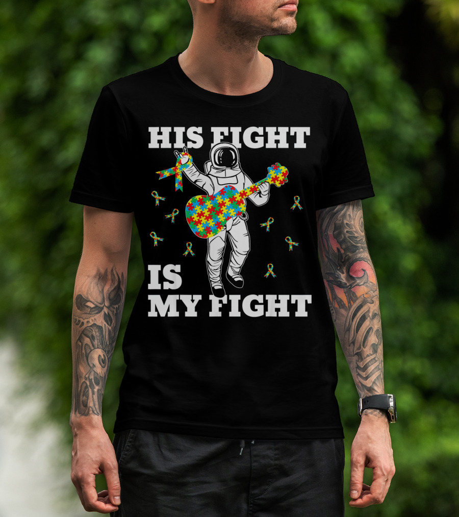 His Fight Is My Fight Autism Awareness Astronaut With Puzzle Guitar T-Shirt