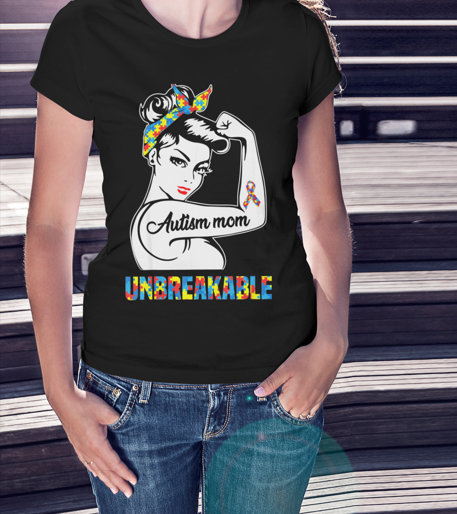 Autism Mom Unbreakable Autism Puzzle Ribbon Rosie The Riveter T-Shirt
