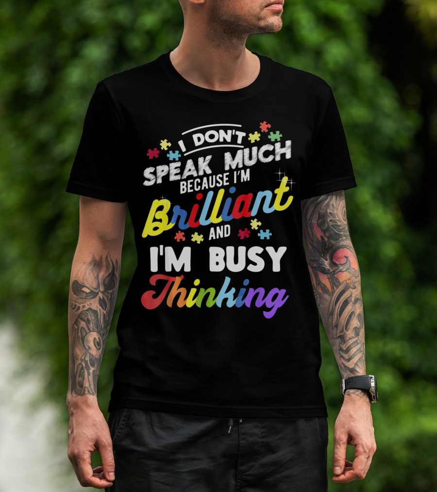 I Don't Speak Much Because I'm Brilliant And I'm Busy Thinking Fun Autism Awareness Puzzle Pieces T-Shirt