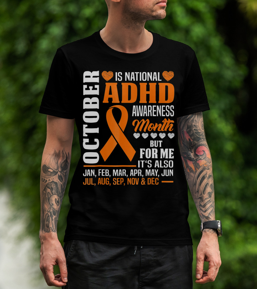 October Is National ADHD Awareness Month Ribbon And Hearts All Year T-Shirt