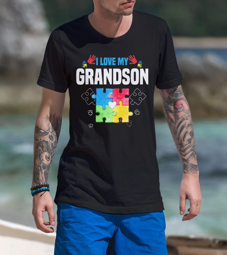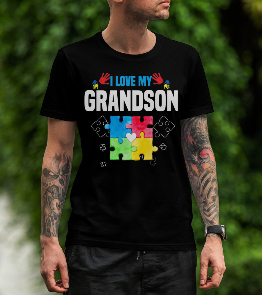 I Love My Grandson Autism Awareness Puzzle Pieces And Colorful Handprints T-Shirt