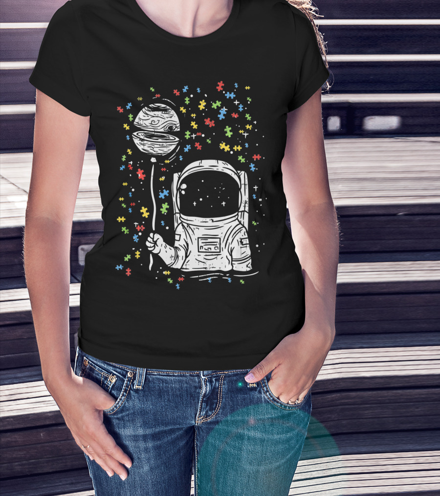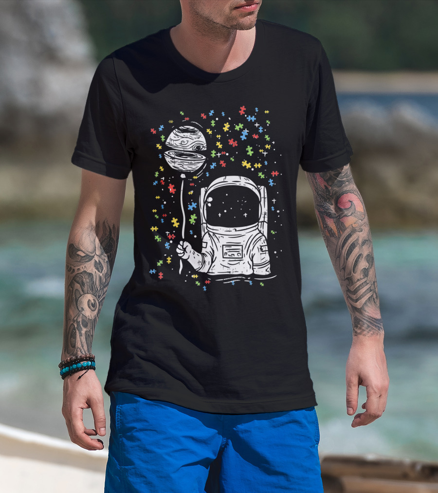 Astronaut Holding Planet Balloon With Puzzle Pieces For Autism Awareness T-Shirt