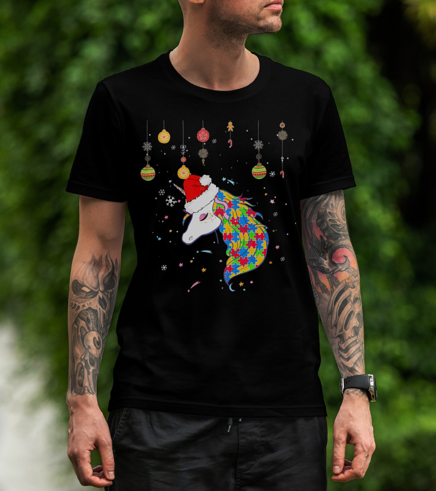 Christmas Unicorn Santa Hat Autism Puzzle T-Shirt