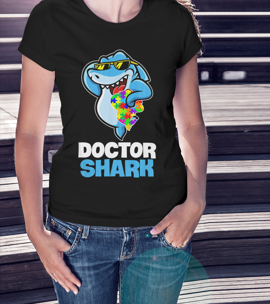 Doctor Shark Sunglasses Holding Autism Puzzle Heart T-Shirt
