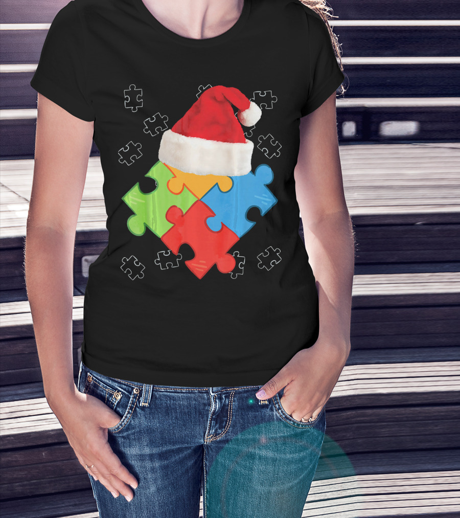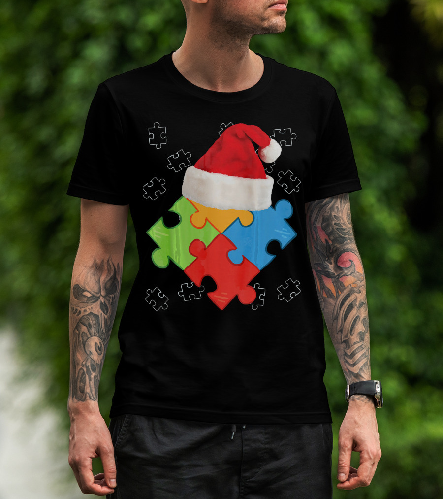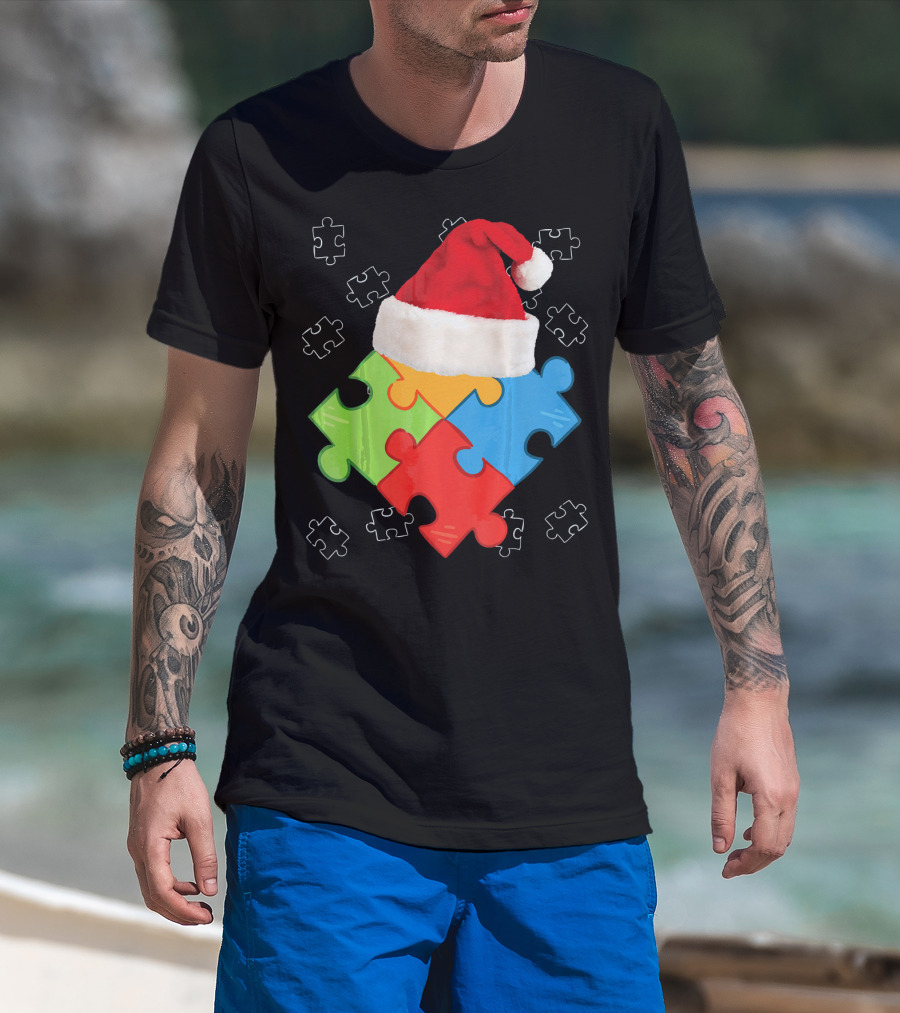 Autism Puzzle Pieces With Santa Hat Holiday T-Shirt