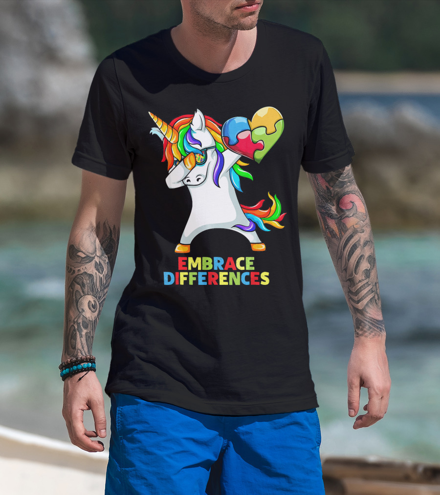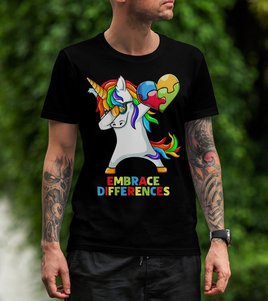 The Dabbing Unicorn Embrace Differences Autism Puzzle Heart T-shirt is designed for everyday wear and a consistent fit. Fabric is pre-shrunk ring-spun cotton with durable stitching. See the size chart below for exact measurements.