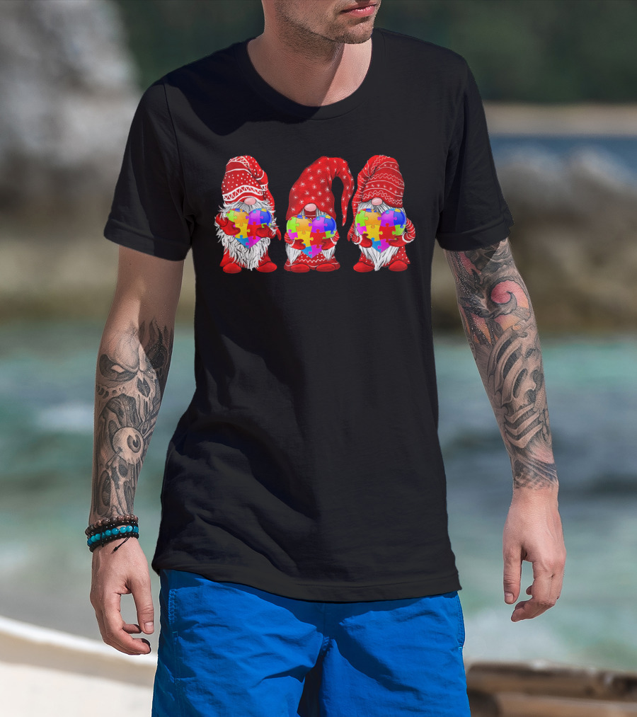 Autism Awareness Gnomies Red Hats Holding Colorful Puzzle Pieces T-Shirt