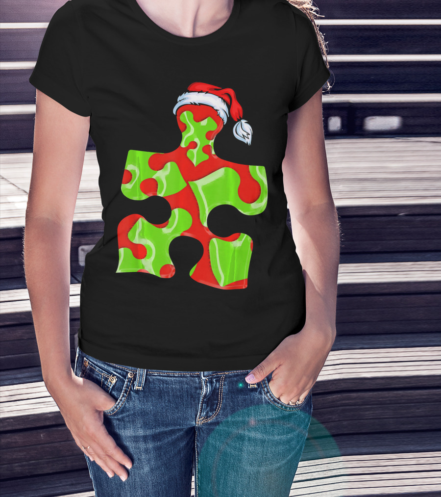 Puzzle Piece Santa Hat Red Green Autism Awareness T-Shirt