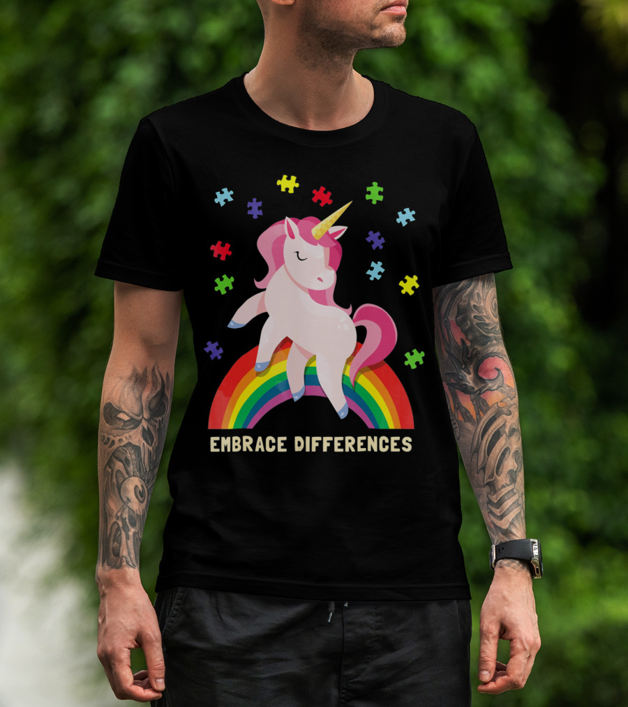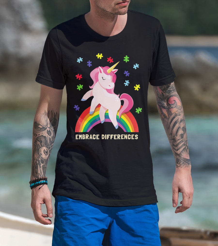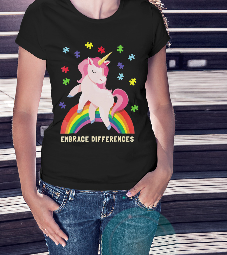 Embrace Differences Autism Awareness Youth Unicorn Rainbow Puzzle Pieces T-Shirt