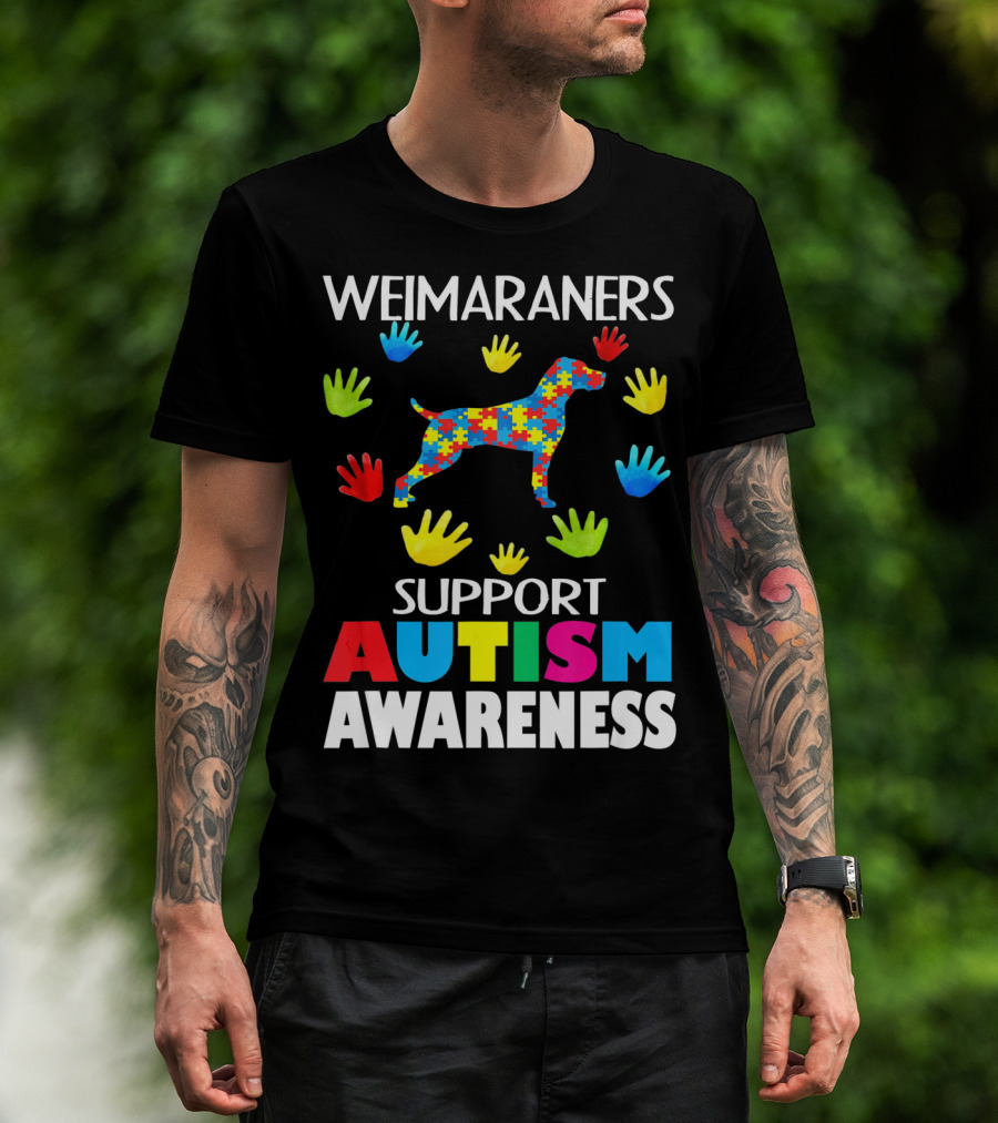 The Weimaraners Support Autism Awareness Puzzle Piece Dog with Colorful Hands T-shirt is designed for everyday wear and a consistent fit. Fabric is pre-shrunk ring-spun cotton with durable stitching. See the size chart below for exact measurements.